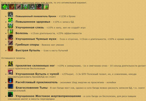Таланты: Болезнь, Быстрая бутыль, Чумные мухи, Повышенный показатель брони, Улучшенная слизь, Грибные Споры, Благословение Тьмы(тут можно поставить Повышенное здоровье, Цветение или что-либо на ваш выбор).